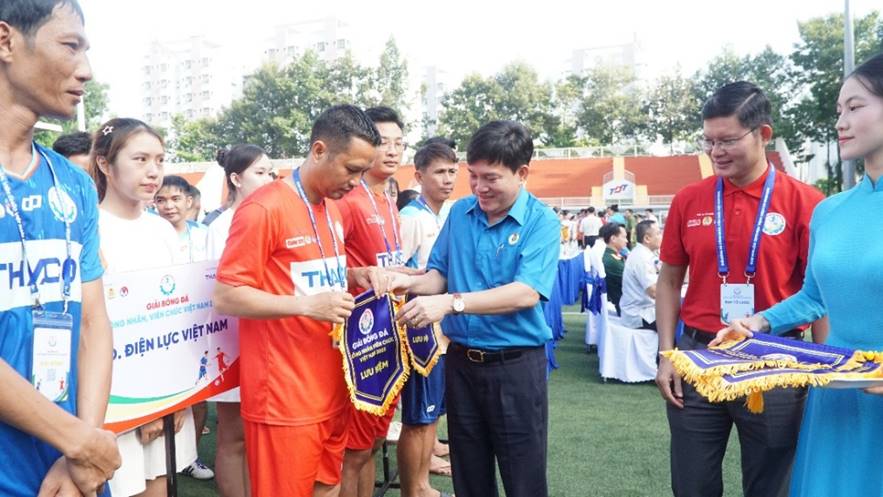 Ông Nguyễn Xuân Hùng - Phó Chủ tịch Tổng Liên đoàn Lao động Việt Nam trao cờ lưu niệm cho Đội Công đoàn Điện lực Việt Nam